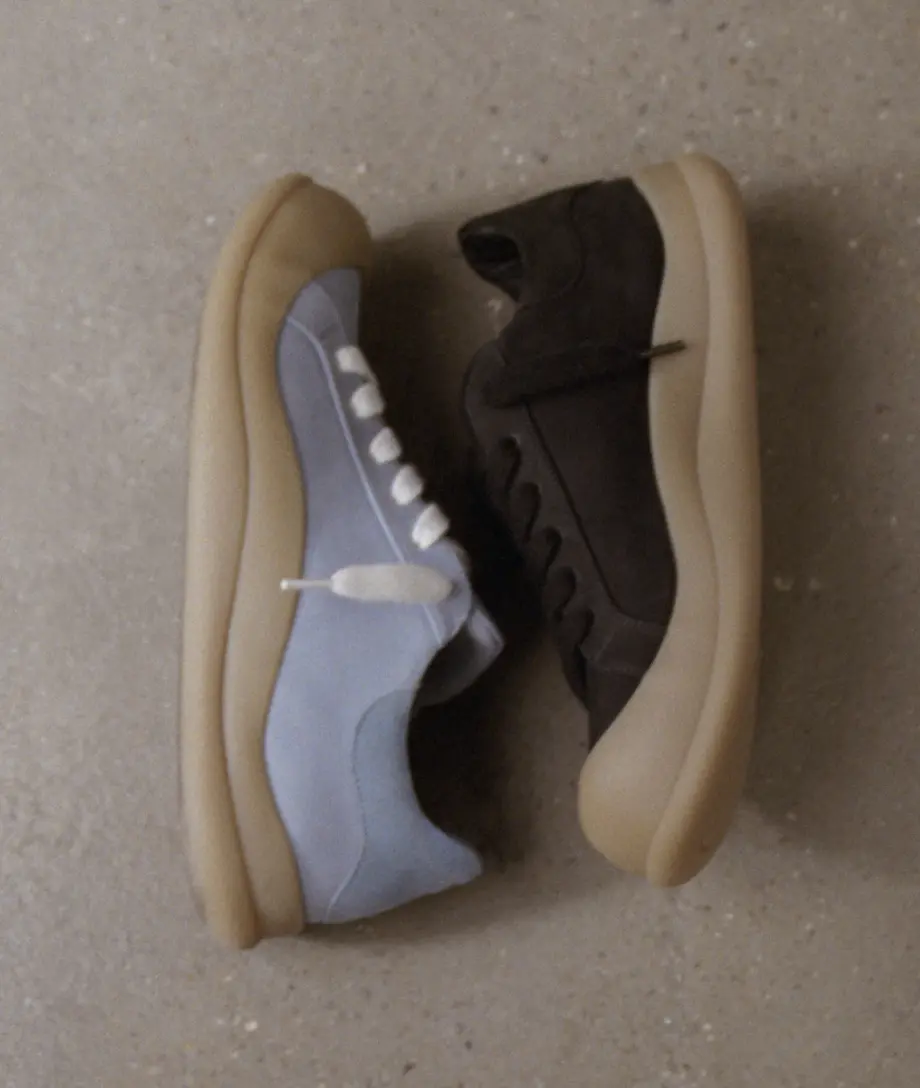 Enfin, la nouvelle sneaker Squish est au centre de cette collection. Sculpturale et ludique, elle réinvente les codes habituels avec ses courbes exagérées et une semelle gomme compressée soulignant une tige tactile. Fabriquée à la main au Portugal en nubuck et suède premium, elle puise son inspiration dans la culture skate, la sculpture moderne et les lignes organiques, déclinée ici en noir/gomme et bleu/gomme, reflétant les lignes expressives caractéristiques d’Armstrong.